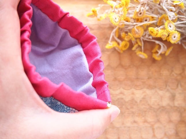 ☆口布はピンクのリネン、裏地はスミレ色のコットンリネンです。