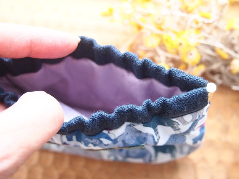 ☆口布はネイビーのリネン、裏地はスミレ色のコットンリネンです。