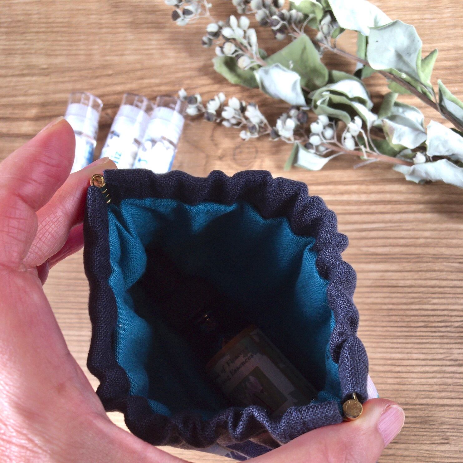 ☆口布はネイビーのリネン、裏地はブルーのコットンリネンです。