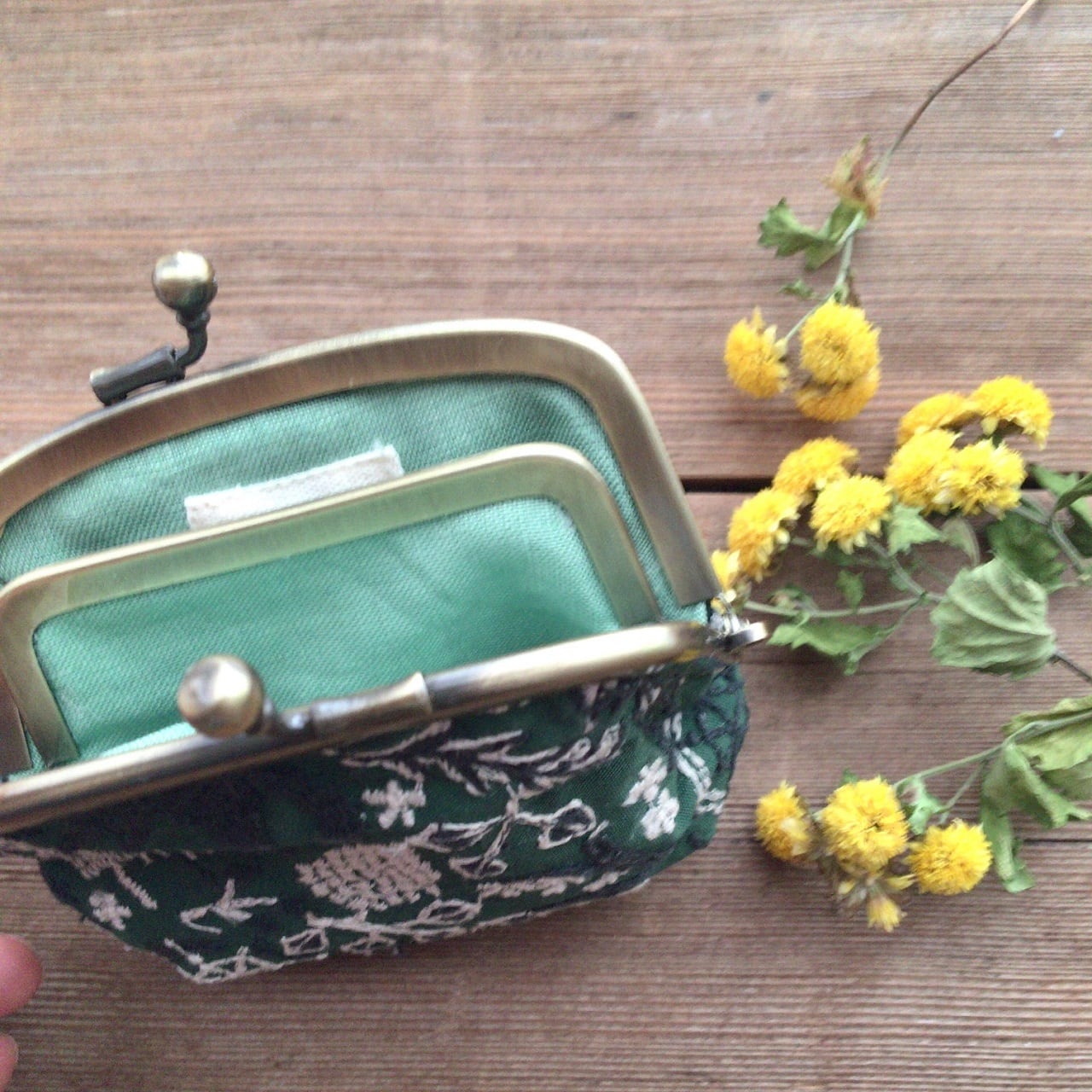 ☆表地に、点と線模様製作所 の【キツネノ小道】、裏地にミントグリーンのリネンを使用したがまぐちポーチです。