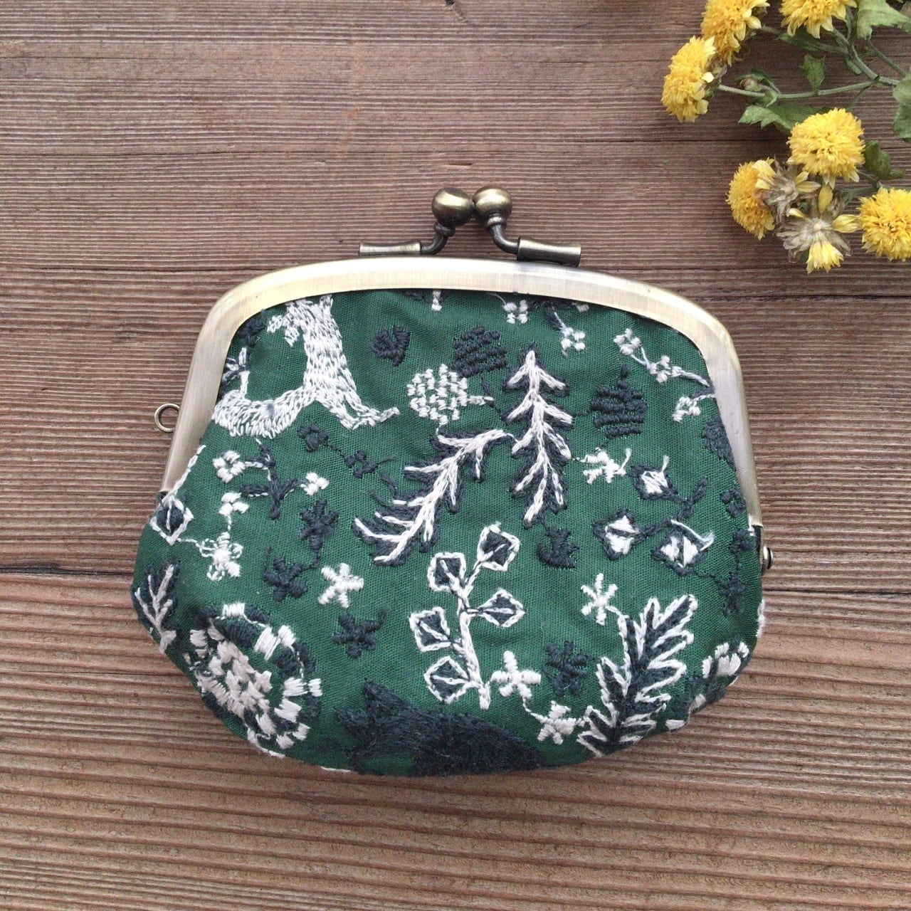 繊細な刺繍で木の実、きのこ、クモの巣、ユリの花…など